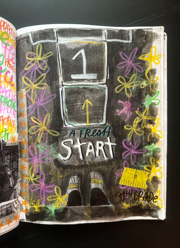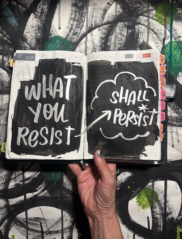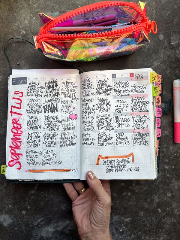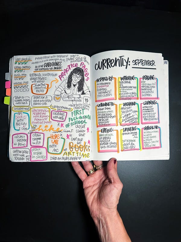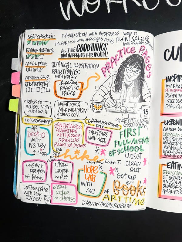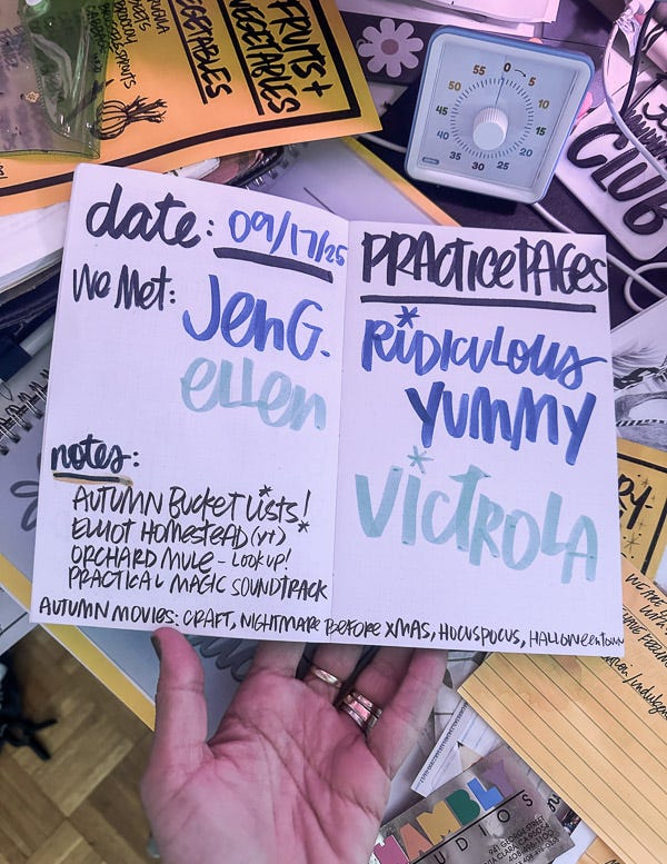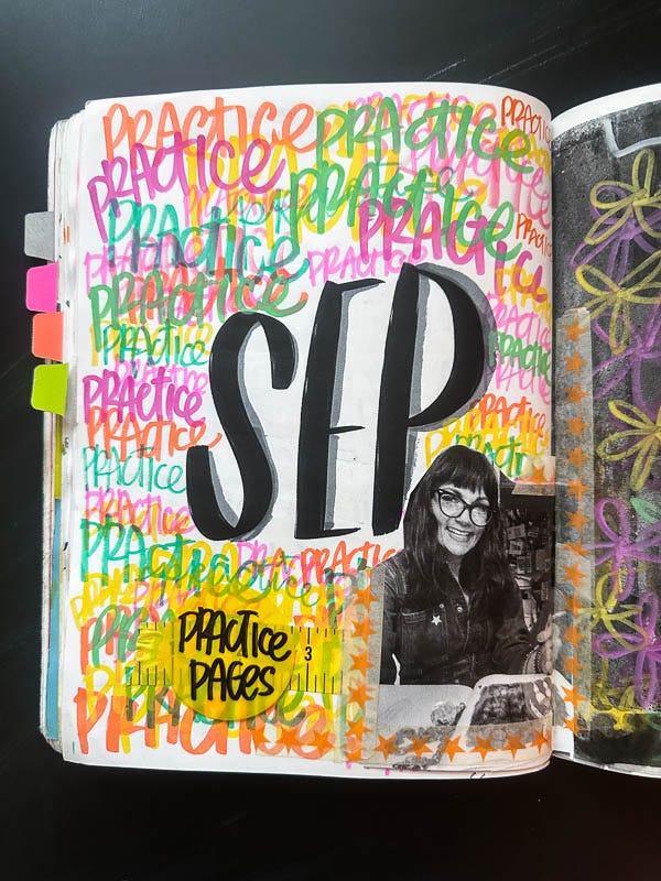 In September, I started Practice Pages!!! It’s a paid subscriber thing for my Substack community. I’m hosting two monthly zoom calls to help you check in with yourself/journals/workbooks. As you can see here, I practiced the word PRACTICE. I love playing around with color combos and seeing how I can make new colors when they cross over.