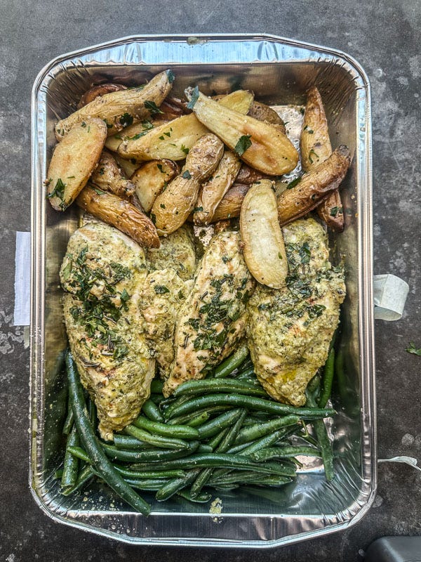While they were gone, I saw what meal prep was like when I bought myself a family meal from Whole Foods. I ate a lot of salad that week. This was too much chicken for one person. I froze some of it.