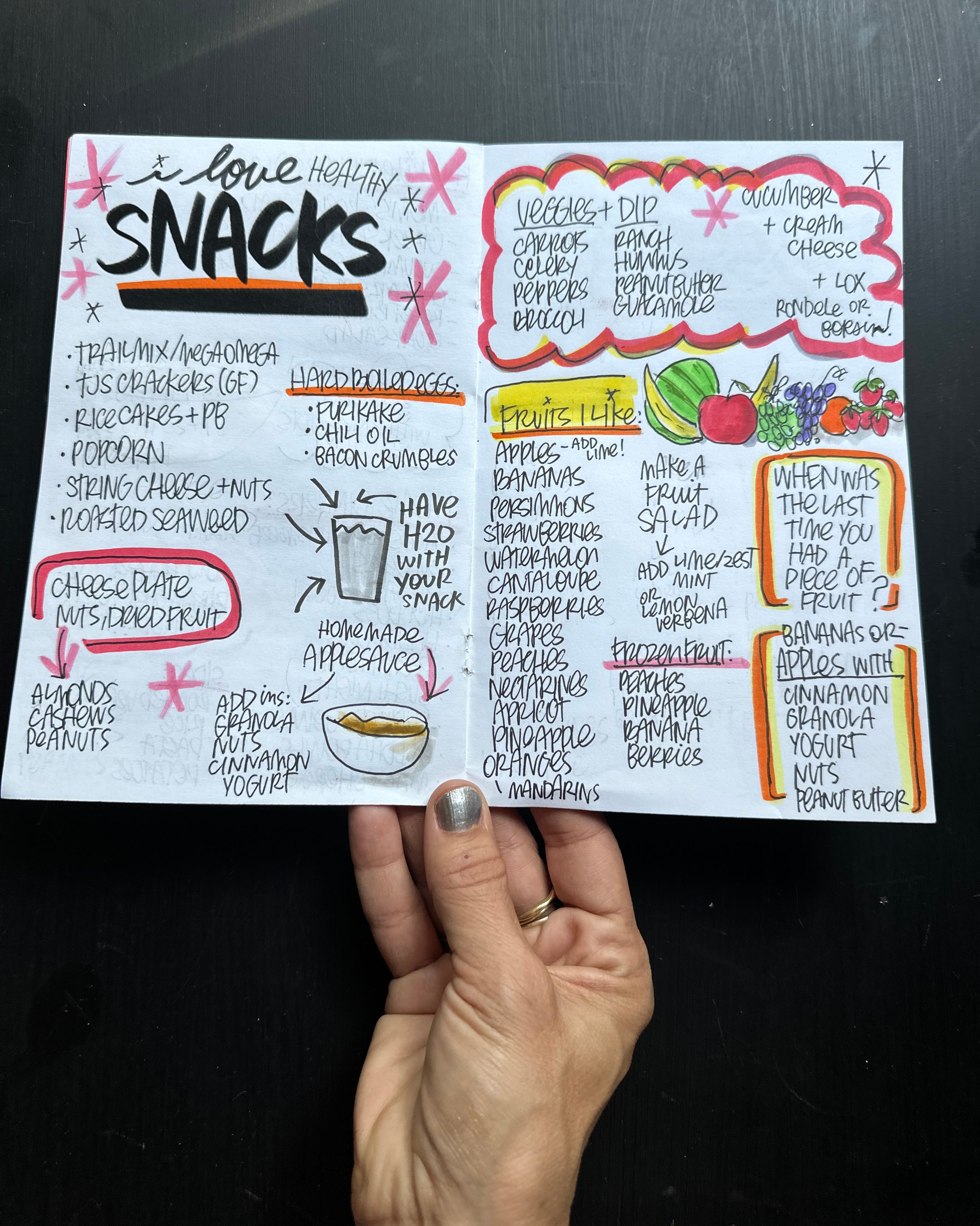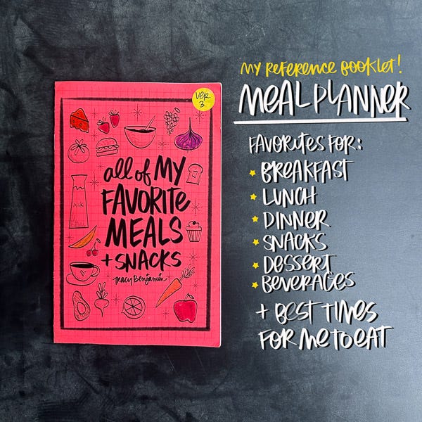 Since I am now in maintenance mode, I’ve been working on finding what foods fit my current lifestyle. Approaching it with curiosity and play (through art!) has helped me solidify a solid meal planning arsenal. In this booklet, I’ve written down all my favorite breakfasts, lunches, dinners, snacks, desserts & beverages so I have something to refer to when I’m meal planning and making grocery lists. Writing things down is how I make things stick!